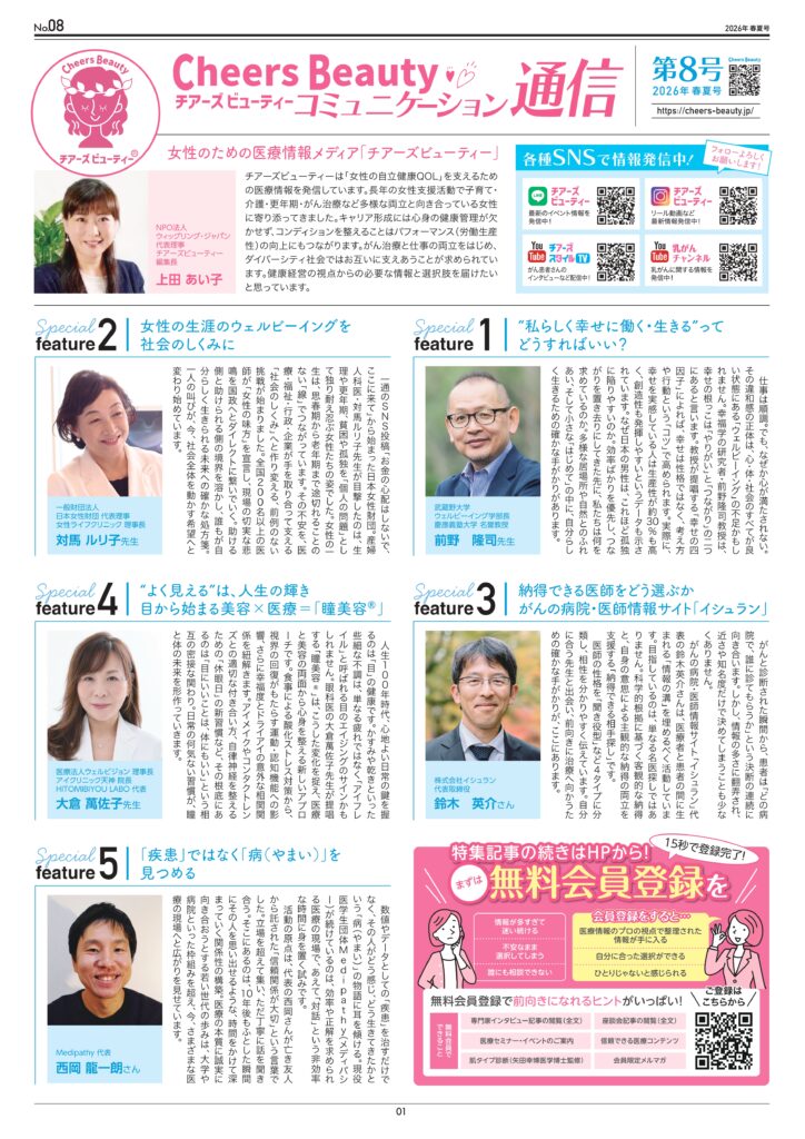 チアーズビューティーコミュニケーション通信Vol.08 2026.04.09 新着情報 【チアーズビューティーコミュニケーション通信】 全国配布中! 第8号(2026年春夏号)ができました!! 第8号(2026年春夏号) 表面 第8号(2026年春夏号) 中面 全国のがん拠点病院、クリニック、薬局、サロン、企業、大学に配布しています。 配布先募集中 Tweet 「幸せの黄色いレシートキャンペーン」ご協力の御礼 前の記事 じゃことひじきの炊き込みご飯 次の記事 関連記事 お知らせ WOMAN Life博に参加しました! 女性の健康情報ナビ “私らしく幸せに働く・生きる”って、どうすればいい?──ウェルビーイング研究者・前野隆司さんと考える幸せのヒント お知らせ 4月医療セミナーが市政だよりに掲載されています 女性の健康情報ナビ “生理は我慢するもの”はもう古い〜高校生を対象にした生理×QOLの研究で見えてきたもの