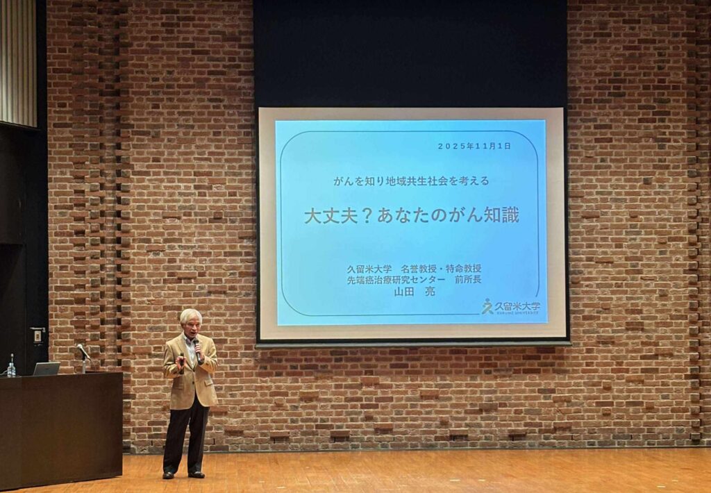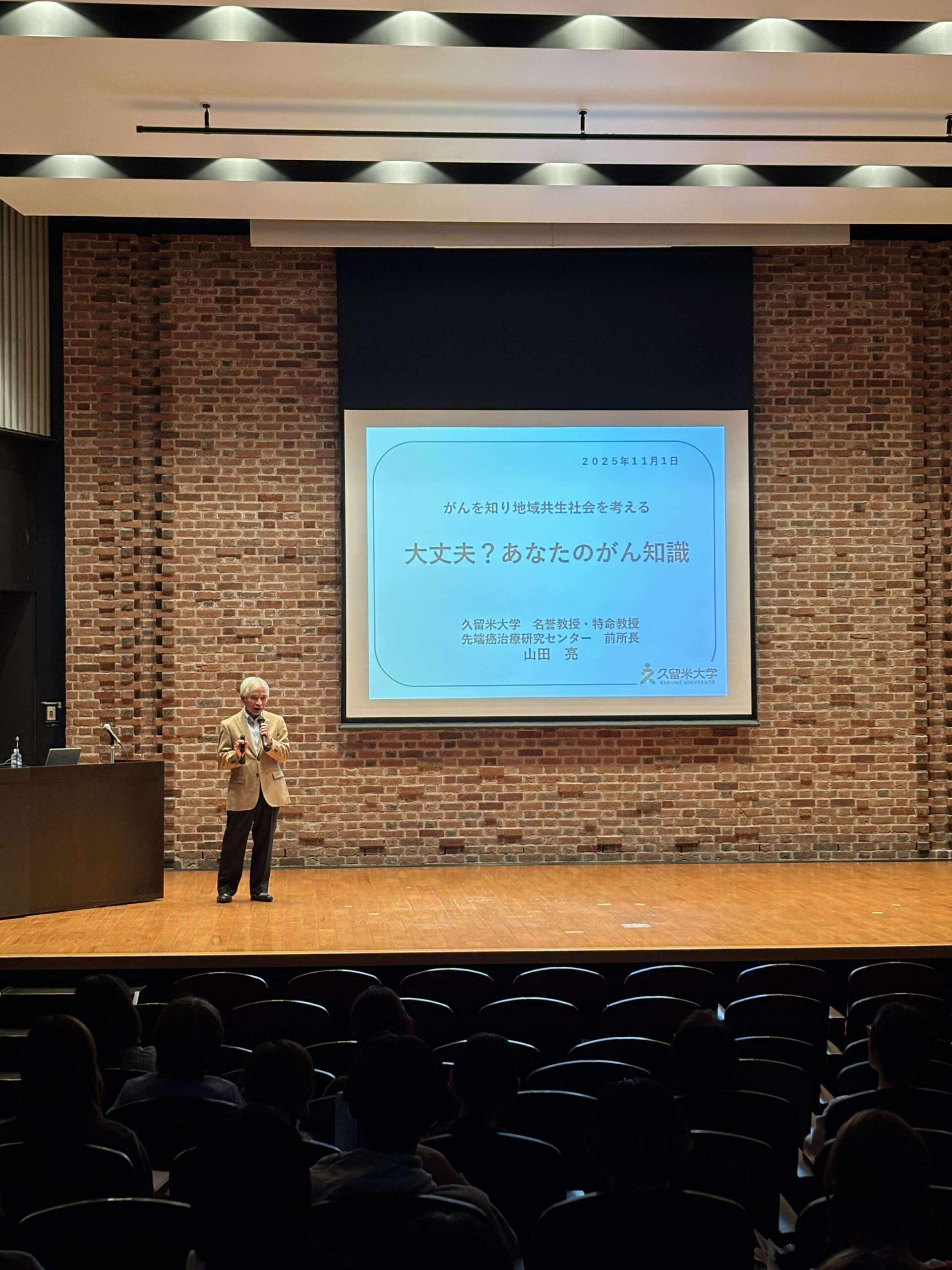 がんについて最先端の知識をお持ちで、治療研究をされている久留米大学、名誉教授の山田亮先生をお迎えし、「大丈夫?あなたのがんの知識」という演題で基調講演をいただきました。