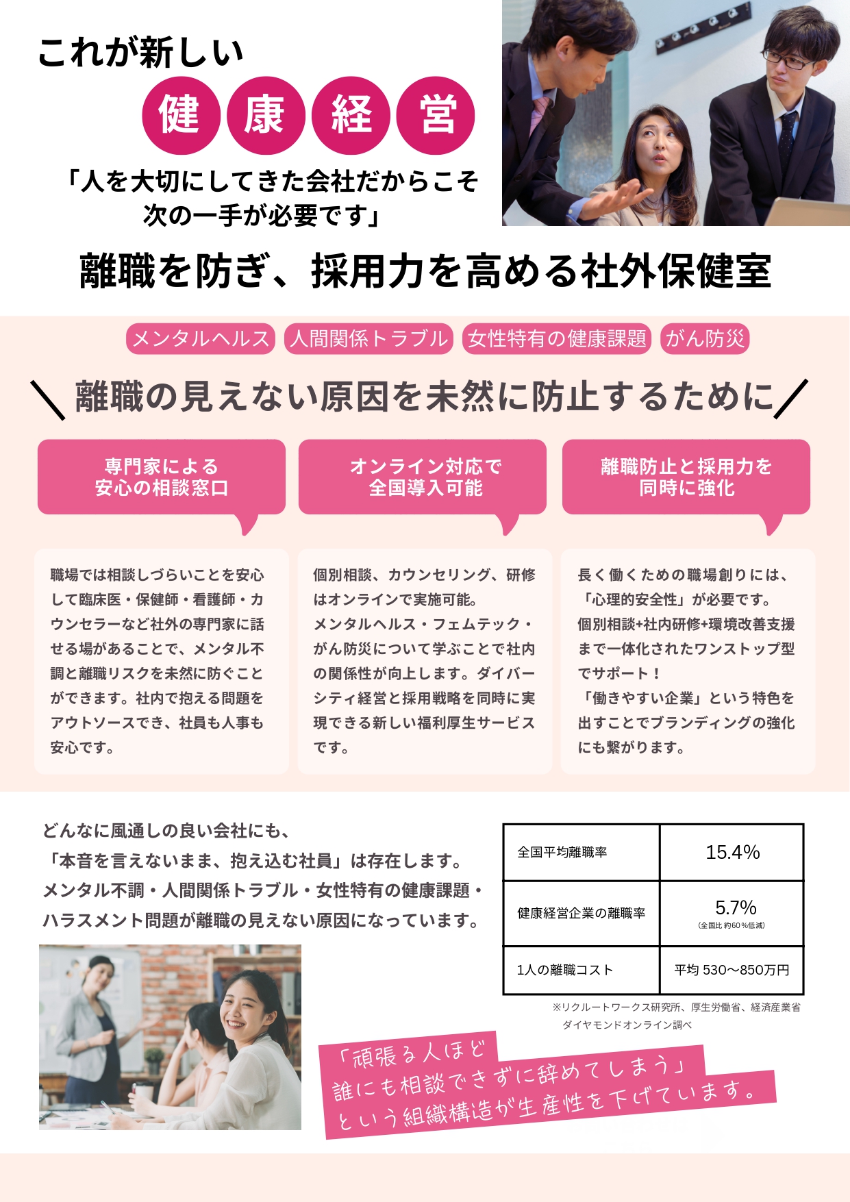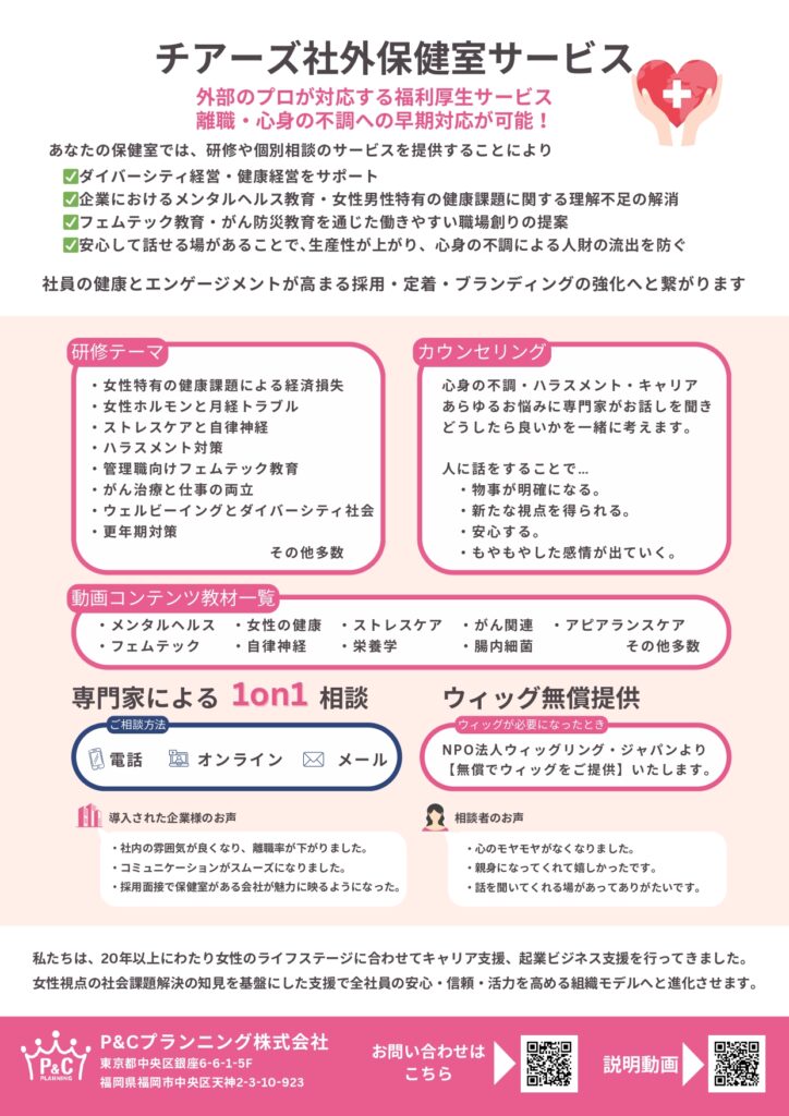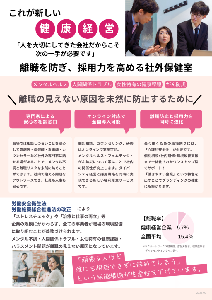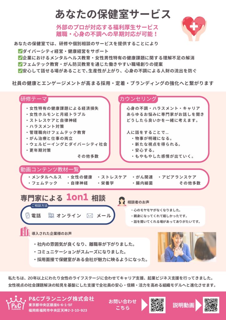 新しい健康経営で人を生かす企業創りを 【働く世代の健康課題は社会課題です】働きやすい職場創り、人を生かす企業創り福利厚生のお手伝いになります。企業の規模・雇用形態・業種・エリアは問いません。ぜひお気軽にお問い合わせください。 動画で内容をチェック 必須 お問い合わせ内容 保健室サービスについて知りたい社内研修・勉強会について福利厚生についてコミュニケーション通信広告掲載についてその他お問い合わせ・相談 必須 お名前 必須 メールアドレス 必須法人名 必須郵便番号 必須都道府県 必須ご住所 必須お電話番号 必須メッセージ本文
