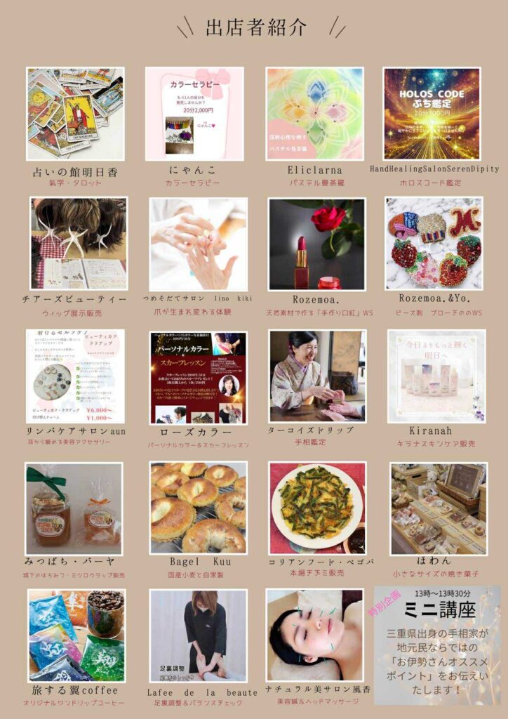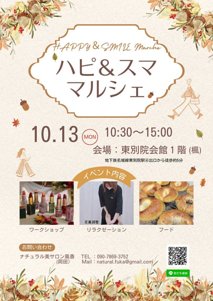 ハピ&スマ マルシェ2025年10月13日(月) 2025.10.07 開催日: 2025年10月13日 10:30 AM - 3:00 PMカテゴリー: 特別イベント マルシェ出店のお知らせ🎀~ハピ&スママルシェ~チアーズビューティーでは、ウィッグを展示いたします。✨他にも様々なブースが出店🍀みなさまお誘い合わせの上ぜひご来場ください🩷日 時:2025年10月13日(月)10:30~15:00会 場:愛知県名古屋市中区橘2-8-45 東京交流会2025年9月2日(水)19:00~ 前の記事